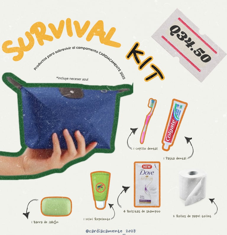 Productos para sobrevivir al campamanto CARDIACAMENTE 2025. Incluye la bolsita o neceser azul de la imagen, también: